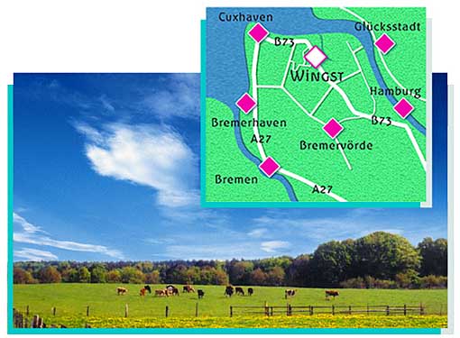 Mit dem Auto auf der B 73 bis Abfahrt Wingst/Zoo (Wingst hat drei Abfahrten!) Bleiben Sie auf dieser Strasse. Nach ca. 800 m finden Sie auf der linken Seite das Parkhotel KECK ehemalig Waldschlösschen, rechts geht es zum Zoo in der Wingst. Biegen Sie nicht zum Zoo ab! Nach der nächsten Kurve kommt rechts die Einfahrt zur Schule. Die Auffahrt zum Haus führt auch zum Parkplatz. (Dieser ist von der Straße aus nicht zu sehen!)